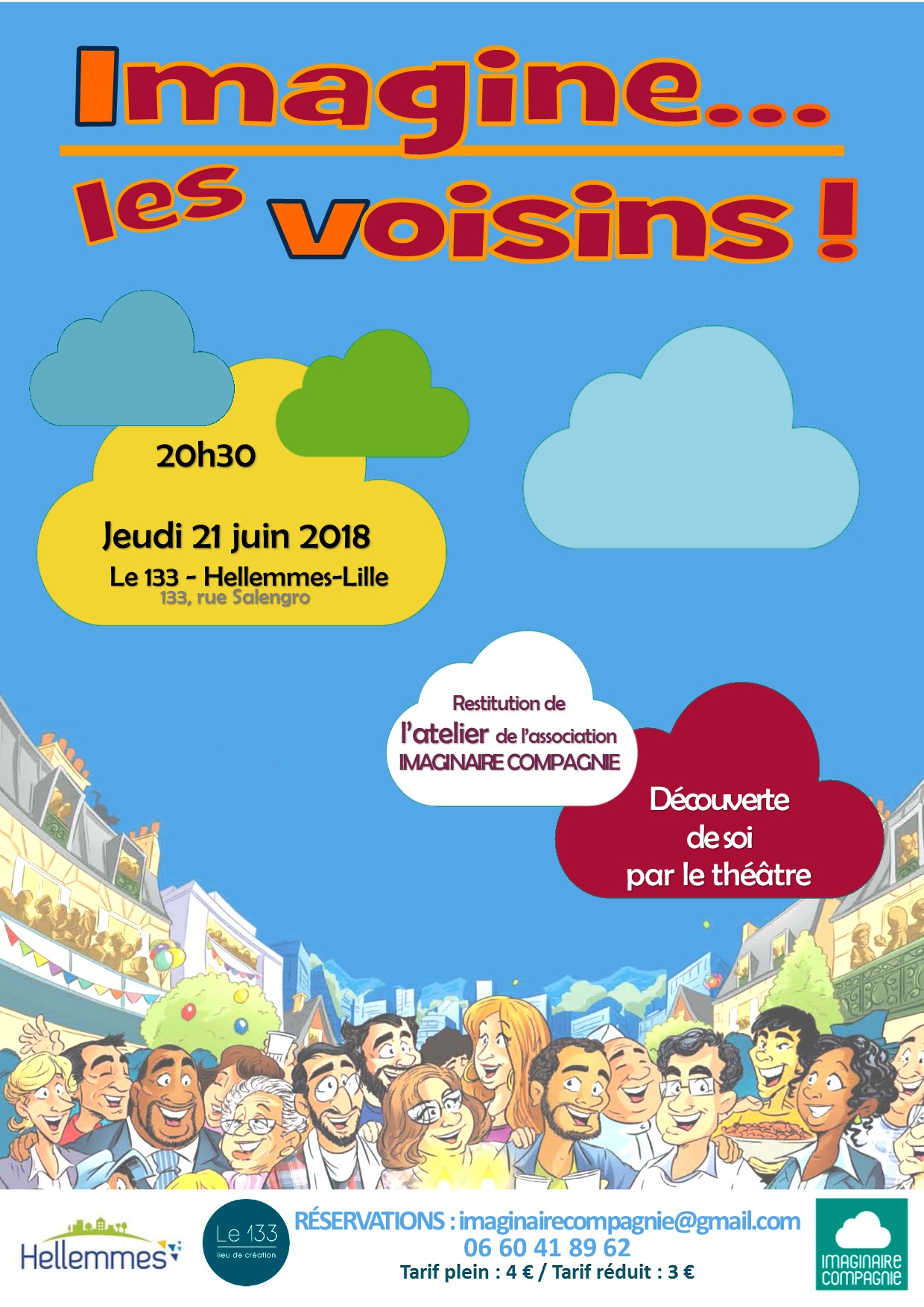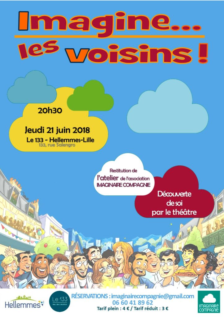 Après une année de travail assidu, d’expériences artistico-théâtrales et de répétitions conviviales, les comédiens des ateliers de « découverte de soi par le théâtre » et de « pratique théâtrale » de l’association « Imaginaire Compagnie » vous invitent à découvrir leur nouvelle création : « Imagine … les voisins » !